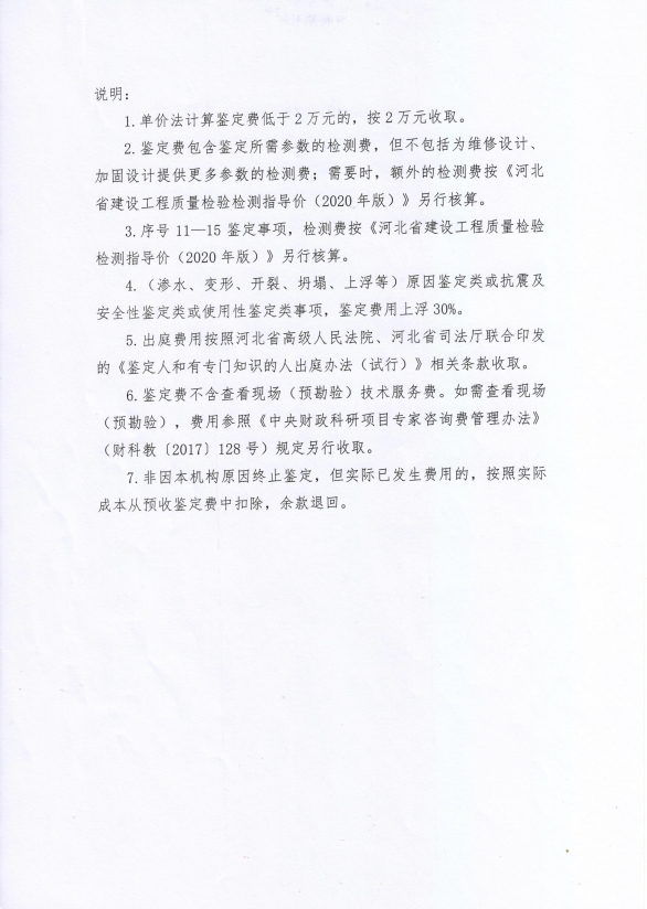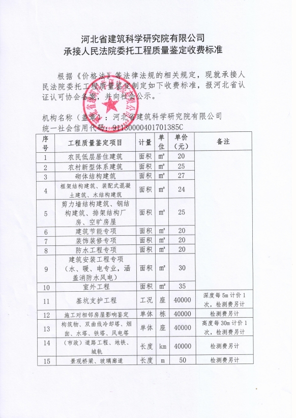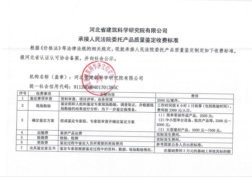 根據(jù)《河北省認(rèn)證認(rèn)可協(xié)會產(chǎn)品質(zhì)量鑒定管理辦法(試行)》第36條、《河北省認(rèn)證認(rèn)可協(xié)會工程質(zhì)量鑒定管理辦法(試行)》第35條“目前國家物價管理部門未對工程質(zhì)量鑒定收費(fèi)進(jìn)行統(tǒng)一定價,鑒定機(jī)構(gòu)應(yīng)當(dāng)公示本機(jī)構(gòu)收費(fèi)標(biāo)準(zhǔn)”之規(guī)定,我公司參照財政部財科教【2017】128號《中央財政科研項目專家咨詢費(fèi)管理辦法》中的有關(guān)規(guī)定,并結(jié)合我公司產(chǎn)品質(zhì)量鑒定和工程質(zhì)量鑒定中鑒定專家工作的實際情況,制定了《河北省建筑科學(xué)研究院有限公司產(chǎn)品質(zhì)量鑒定/工程質(zhì)量鑒定收費(fèi)標(biāo)準(zhǔn)》(見附件)?,F(xiàn)予以公示。