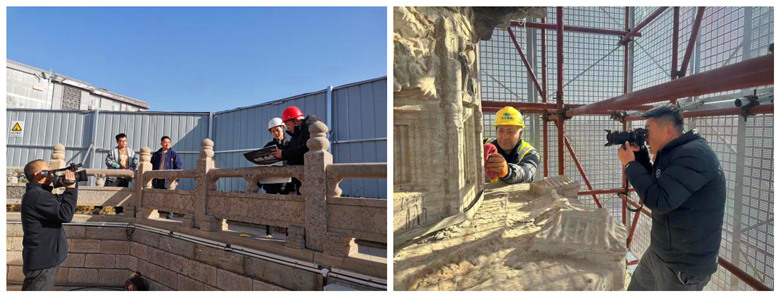 2023年12月8日,趙州陀羅尼經(jīng)幢保護工程施工現(xiàn)場,我公司技術(shù)人員攻堅克難、不畏嚴寒,依然奮斗在施工崗位。在新搭設(shè)的腳手架上,他們牢記文物保護方針,采用科學、合理的技術(shù)手段對石質(zhì)文物表層結(jié)殼、結(jié)膜污染進行清理,并依照方案核對塔身各類殘損病害,為后期的修繕工作做足準備。