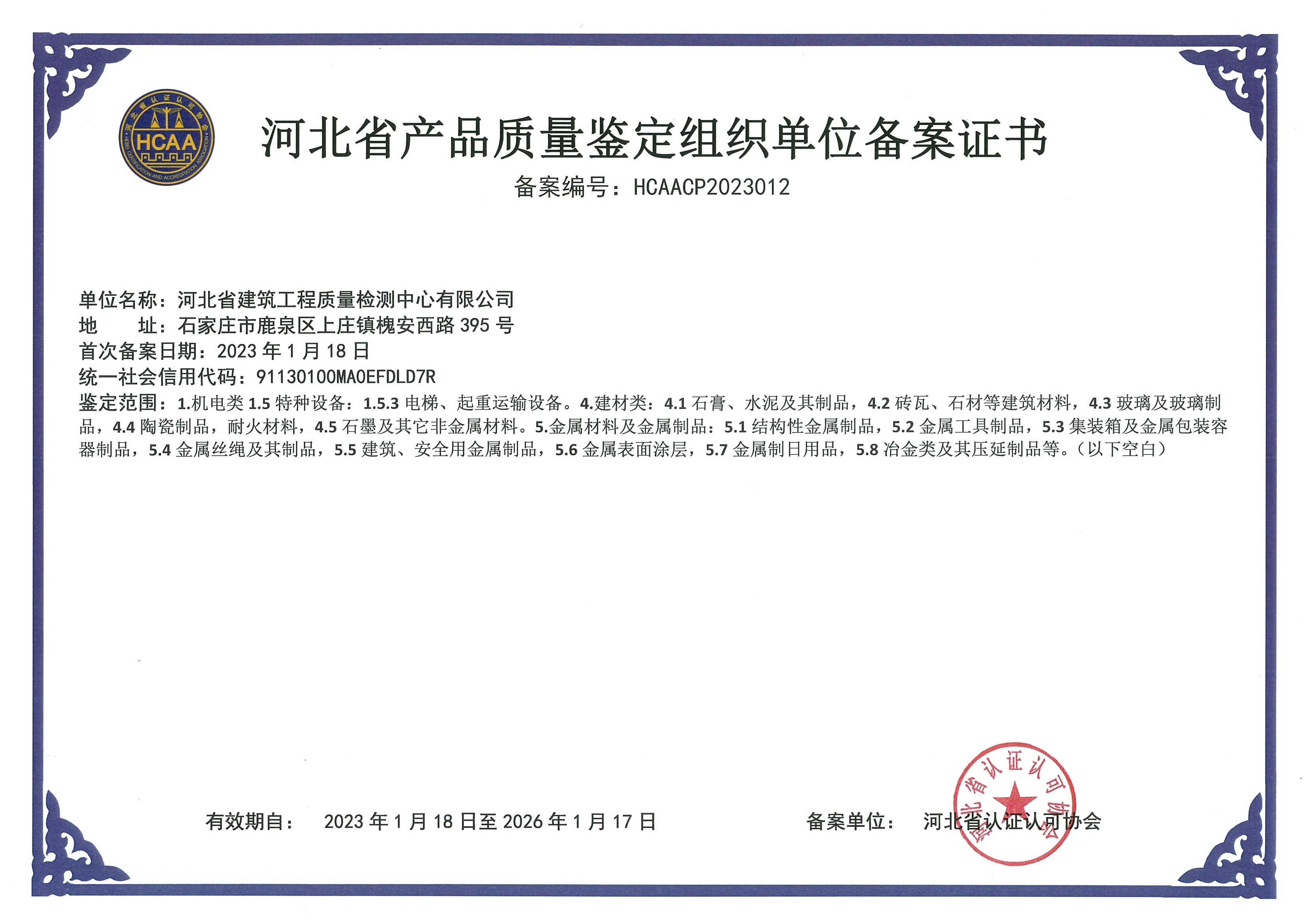 河北省建筑工程質(zhì)量檢測(cè)中心產(chǎn)品質(zhì)量鑒定組織單位備案證書1